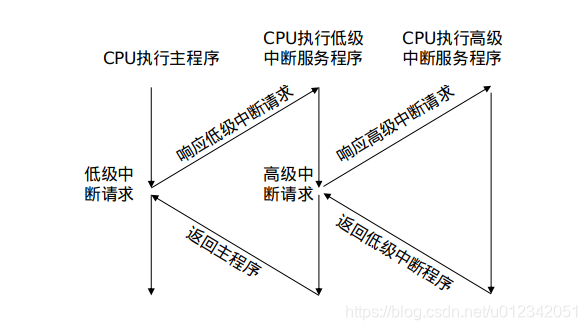 MCS-51的中断请求源有2个中断优先级,每一个中断请求源可由软件定为高优先级中断或低优先级中断,可实现2级中断嵌套,所谓2级中断嵌套,就是CPU正在执行低优先级中断的服务程序时,可被高优先级中断请求所中断,去执行高优先级中断服务程序,待高优先级中断处理完毕后,再返回低优先级中断服务程序。