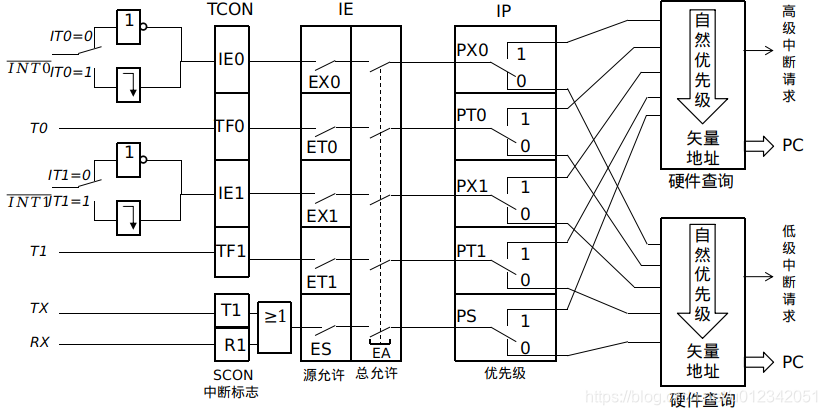 这些中断请求源的中断请求标志位分别由特殊功能寄存器TCON和SCON的相应位锁存。