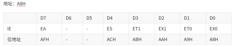 MCS-51的CPU对中断源的开放或屏蔽,是由片内的中断允许寄存器IE控制的。IE的字节地址为A8H,可进行位寻址。其格式如图4-1所示:
