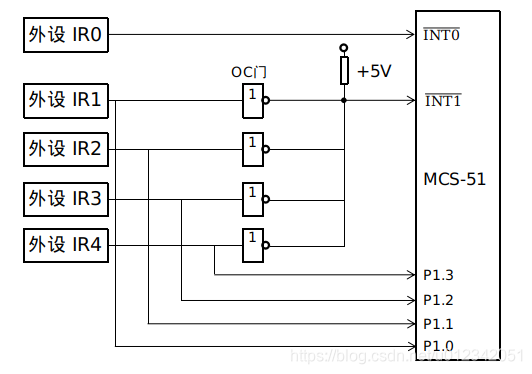 若系统中有多个外部中断请求源,可以按它们的轻重缓急进行排队,把其中最高级别的中断源直接接到MCS-51的一个外部中断请求源IR0输入端,其余的外部中断请求源IR1~IR4用线或的办法连到MSC-51的另一个外中断源输入端