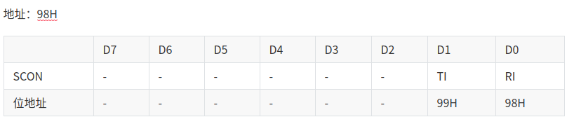SCON为串行口控制寄存器,字节地址为98H,可位寻址。SCON的低2位锁存串行口的发送中断和接收中断的中断请求标志T1和R1,其格式如图3-2所示: