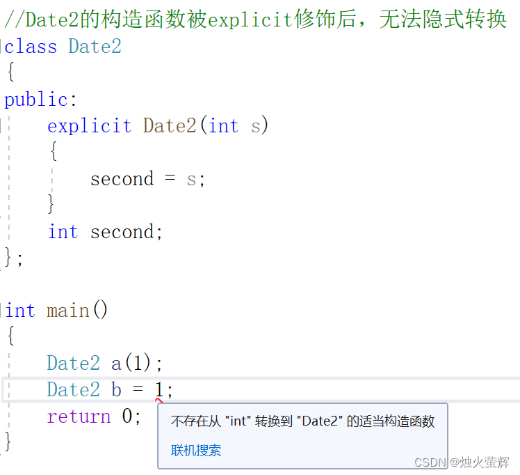 eg. Date2的构造函数(注意修饰的是只有一个参数的构造函数,不是拷贝构造函数)被explicit修饰后,无法隐式转换: