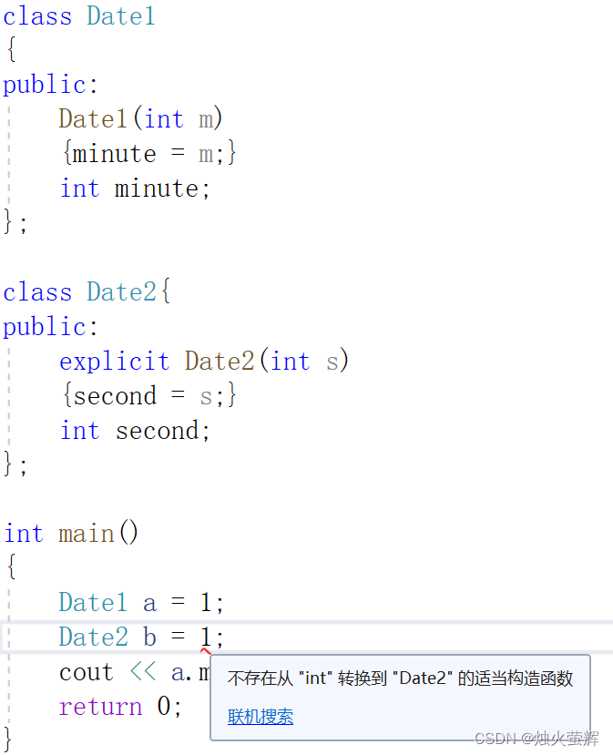 class Date1{ public: Date1(int m) { minute = m; } int minute; }; void PrintDate(const Date1& d){ cout << d.minute << endl; } int main() { Date1 b = 1; PrintDate(1); return 0; }这样的代码的可读性和可维护性无疑是很差的,在多人合作的项目中极其容易引起误会。
