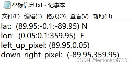 上面可以看到,纬度共180°被分为了1800行,经度共360°被分为了3600列。官网上下载的坐标信息显示左上角纬度89.95°,经度0.05°;右下角纬度-88.95°,经度359.95°。