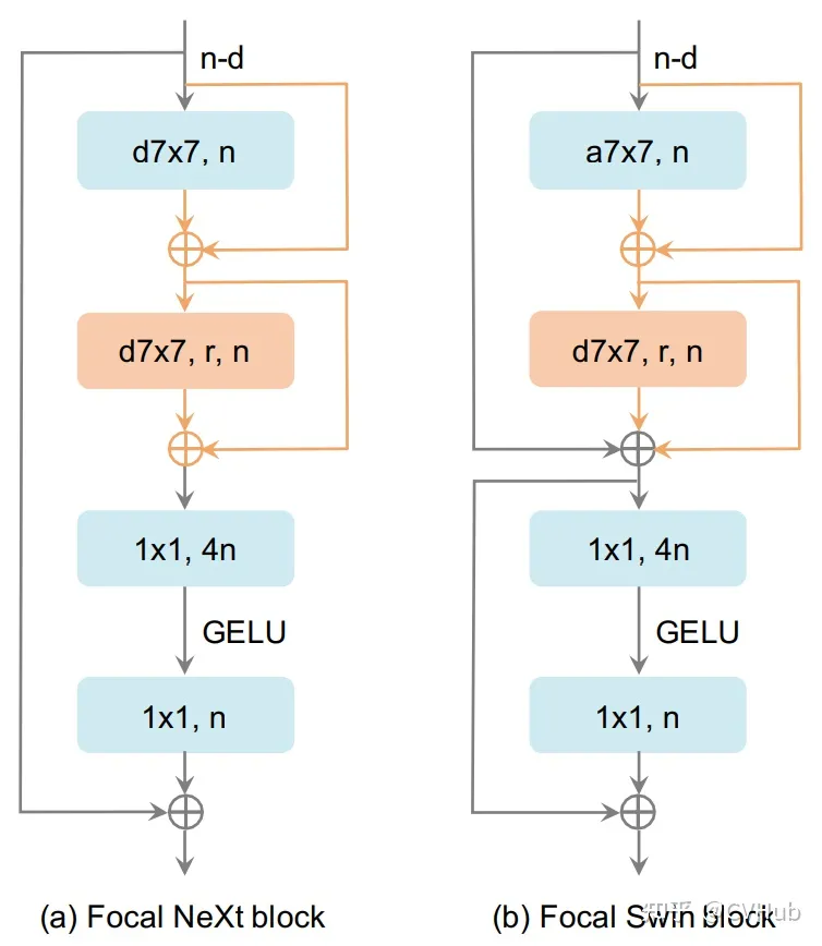 如上图所示,本文提出了两种聚焦块的设计,它们分别是基于ConvNeXt块和Swin Transformer块构建的。橙色部分是添加到两个块中的操作。N为输出特征的通道数。D7×7表示7×7深度卷积,a7×7表示窗口关注,窗口大小为7×7。R为附加卷积的扩张速率。1×1表示1×1卷积。GELU[35]是激活单位。每个d7×7或a7×7后面都有一个LayerNorm[34]层和一个GELU单元,为清晰起见省略。
