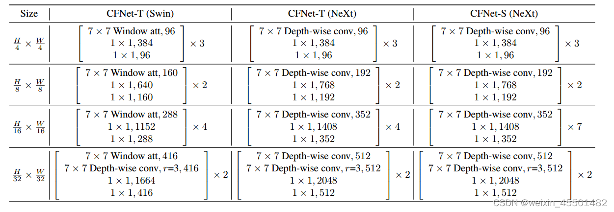 我们构建了三个CFNet变体,即CFNet- t (Swin)、CFNet- t (NeXt)和CFNet- s (NeXt)。T和S分别是tiny和small这两个单词的缩写,表示模型的尺寸。第一个使用Swin Transformer块和焦点Swin块。另外两个使用ConvNeXt块和focal NeXt块。每个CFNet变体的详细配置如下表所示。Swin和NeXt分别表示使用Swin Transformer块和ConvNeXt块来构建CFNet。第一行显示了前N个块的配置。其他三行显示了每个阶段中三个块组的配置,并且所有阶段共享相同的配置。