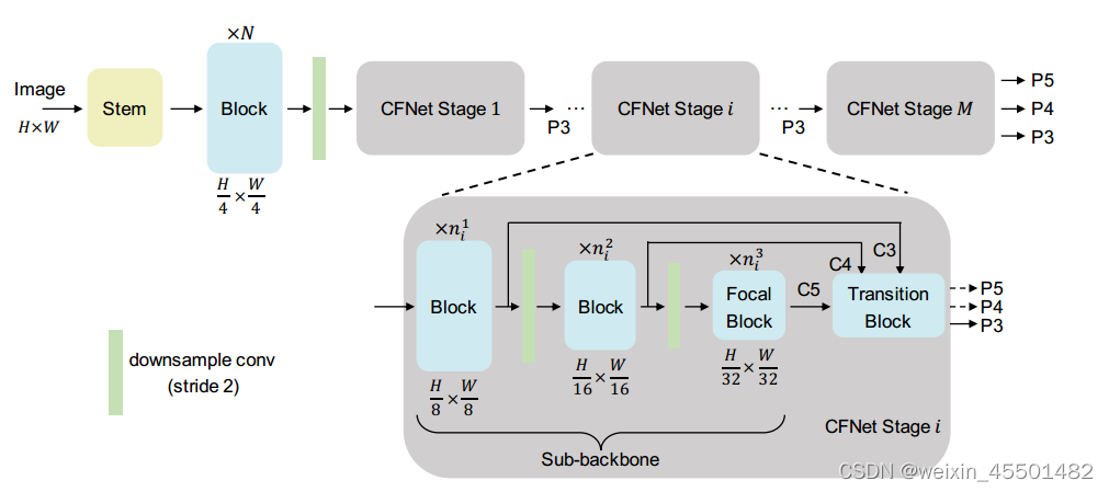 首先将空间大小为H × W的输入图像输入到一个stem(由两个3×3卷积组成,每个卷积的步长为2,每个卷积后面都有一个LayerNorm层和一个GELU单元)和N个连续的block中,提取空间大小为h4 × w4的高分辨率特征。然后,将这些特征送到M级联阶段,提取多尺度特征。值得注意的是,每个阶段的输出都有P3、P4、P5,步幅分别为8、16、32,但只有P3被送入后期。最后,将最后一阶段输出的融合特征P3、P4和P5用于密集预测任务。在整个过程中只有stem和“下采样卷积”减小了特征的空间大小,其他操作并未改变特征空间的大小。