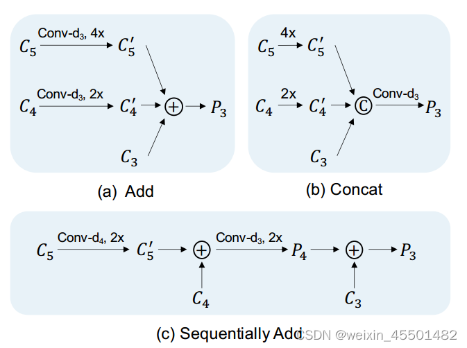 其中“Add”融合首先减少了特征C4和C5的通道数,使C3的通道数与1×1卷积对齐。在进行元素加法之前,使用双线性插值操作来对齐特征的空间大小。“Concat”融合直接对特征C4和C5进行上采样,以对齐空间C3的大小,然后将这些特征连接起来,然后进行1×1卷积以减少通道数。“Sequentially Add”融合上采样样并顺序组合不同尺度的特征。该设计类似于FPN中的融合模块,不同之处在于没有额外的卷积来变换求和特征。以上三种设计在实验中均表现良好