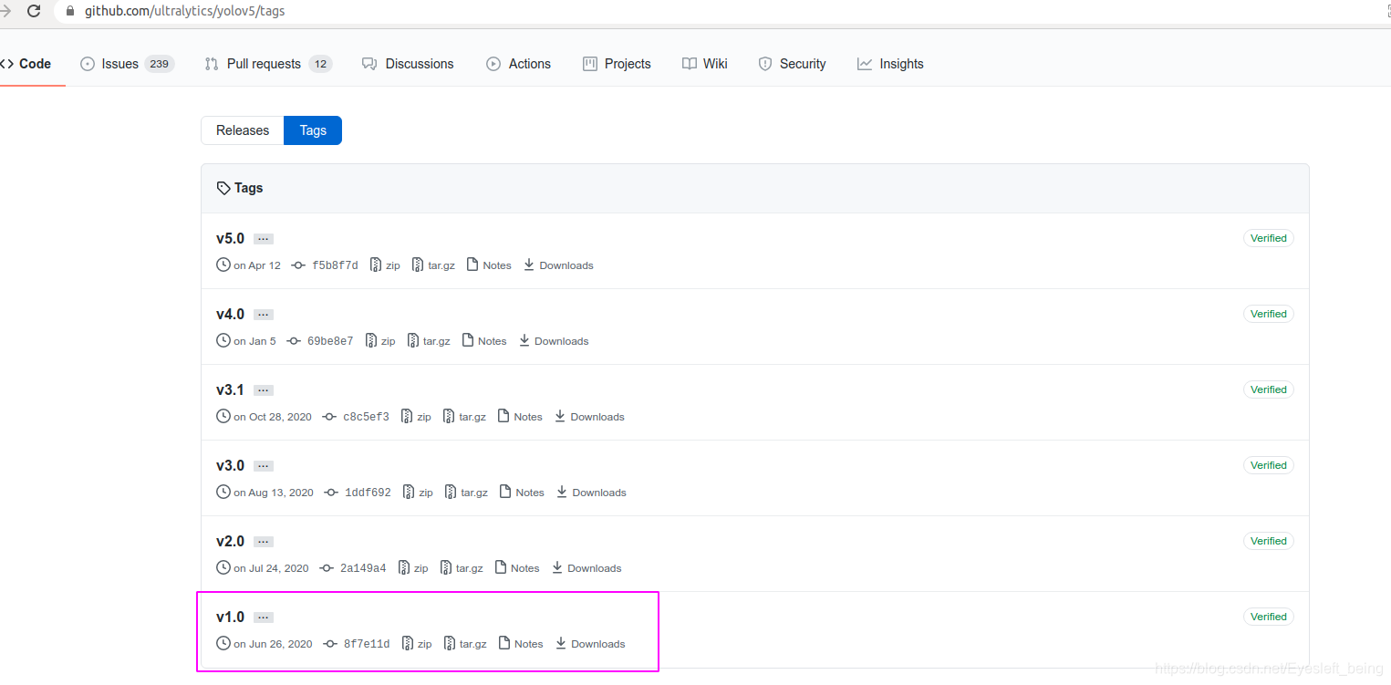 注意这里我们选择tags下的v1.0版本进行训练,不同的版本代码是不一样的,复现过程也有所差异。其中v1.0版本的训练过程和yolov3很相似