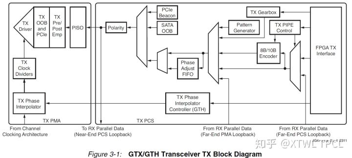 严格说TX应该是Transmitter,表示发送部分。GTX的TX部分结构图如下: