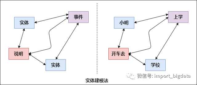 上图表述的是一个抽象的含义,如果我们描述一个简单的事实:“小明开车去学校上学”。以这个业务事实为例,我们可以把“小明”,“学校”看成是一个实体,“上学”描述的是一个业务过程,我们在这里可以抽象为一个具体“事件”,而“开车去”则可以看成是事件“上学”的一个说明。