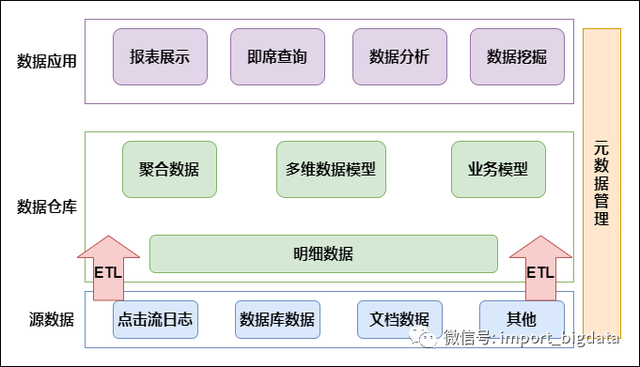 数据仓库的数据来源于不同的源数据,并提供多样的数据应用,数据自下而上流入数据仓库后向上层开放应用,而数据仓库只是中间集成化数据管理的一个平台。