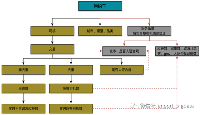 分析数据体系是模型架构中汇总事实表的物理集合,业务逻辑层面根据业务分析对象或场景进行指标体系抽象沉淀。滴滴出行主要是根据分析对象进行主题抽象的,例如司机主题、安全主题、体验主题、城市主题等。指标分类主要是根据实际业务过程进行抽象分类,例如司机交易类指标、司机注册类指标、司机增长类指标等。基础数据体系是模型架构中明细事实表和基础维度表的物理集合,业务逻辑层面根据实际业务场景进行抽象例如司机合规、乘客注册等,还原业务核心业务过程。