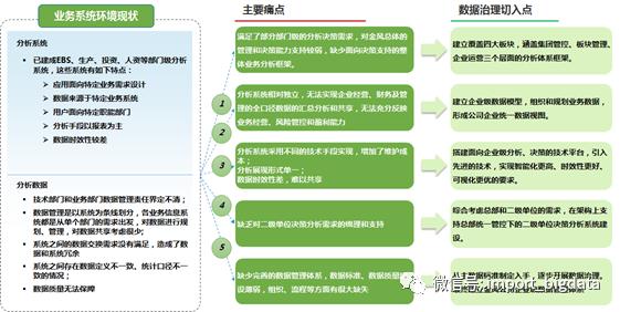 针对企业数据治理所处的内外部环境,从组织、人员、流程、数据四个方面入手,进行数据治理现状的分析。