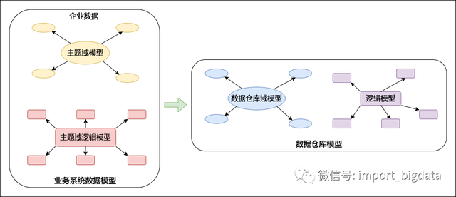 根据 Inmon 的观点,数据仓库模型的建设方法和业务系统的企业数据模型类似。在业务系统中,企业数据模型决定了数据的来源,而企业数据模型也分为两个层次,即主题域模型和逻辑模型。同样,主题域模型可以看成是业务模型的概念模型,而逻辑模型则是域模型在关系型数据库上的实例化。