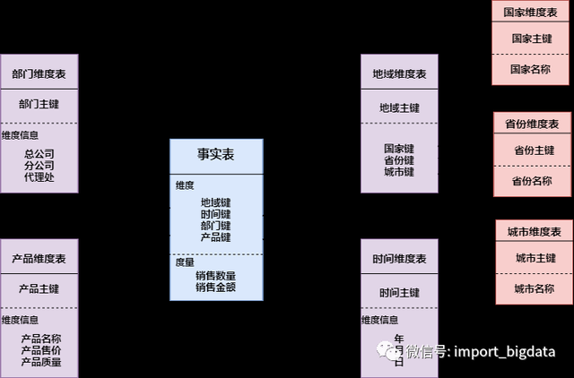 雪花模式雪花模式(Snowflake Schema)是对星形模式的扩展。雪花模式的维度表可以拥有其他维度表的,虽然这种模型相比星型更规范一些,但是由于这种模型不太容易理解,维护成本比较高,而且性能方面需要关联多层维表,性能也比星型模型要低。所以一般不是很常用。