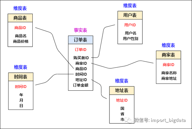 维度表示你要对数据进行分析时所用的一个量,比如你要分析产品销售情况, 你可以选择按类别来进行分析,或按区域来分析。每个类别就构成一个维度。上图中的用户表、商家表、时间表这些都属于维度表,这些表都有一个唯一的主键,然后在表中存放了详细的数据信息。