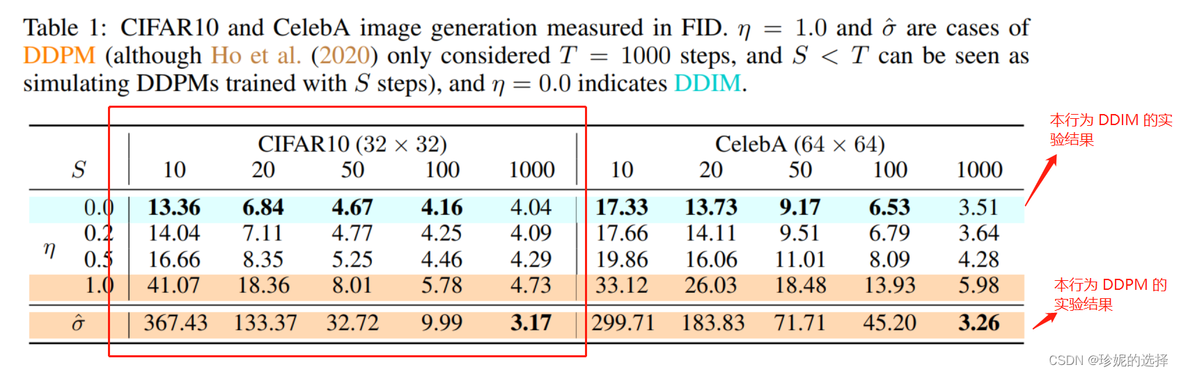 其中第一行(绿线…)是 DDIM 的结果,最后一行是 DDPM 的实验结果,使用 FID 来评估生成图像的质量,该值越小,表示结果越好;S 为迭代次数,只看红框中的 CIFAR10 数据集上的效果,可以发现随着迭代次数的增加,FID 越小,生成图像质量越好;另外可以注意到 DDIM 迭代到第 50 次左右时,就几乎能达到 DDPM 迭代到 1000 次的效果 (4.67 vs. 3.17);