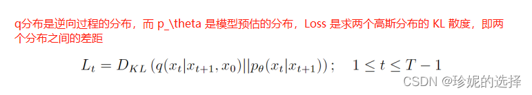 现在逆向过程的分布有了(可以理解为 label),模型的预估分布也有了,就差一个 Loss 函数,而经过数学高手的又一顿推导,发现 Loss 居然是计算两个分布的 KL 散度,而且还是两个高斯分布的 KL 散度!朴素的说,KL 散度可以用来描述两个分布之间的差距。不得不感慨,数学就是这么神奇,左推右推,最后能得到一个美妙的结果: