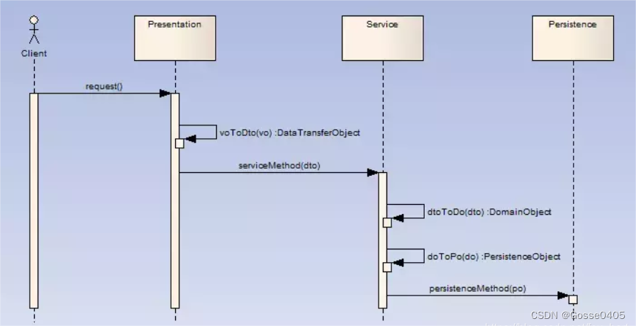 下面以一个时序图建立简单模型来描述上述对象在三层架构应用中的位置: