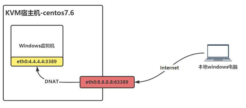 由于KVM内运行的windows虚拟机默认网络和外部隔离,外部的windows电脑不能直接连接至windows虚拟机,因此需要在KVM宿主机上配置端口映射规则。