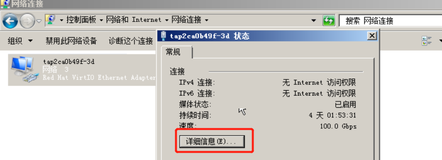 打开 控制面板–>网络和Internet–>网络连接。点击windows虚拟机的网卡,点击详细信息