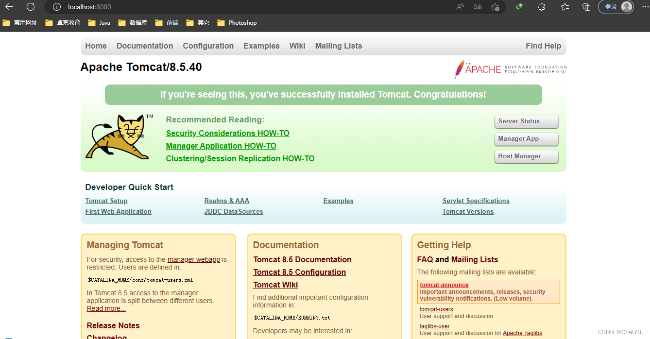 到这里就基本结束了,如何查看是否部署成功?右键Tomcat,开启服务后,进入浏览器输入http://localhost:8080 如果出现Tomcat主页,说明已经成功了