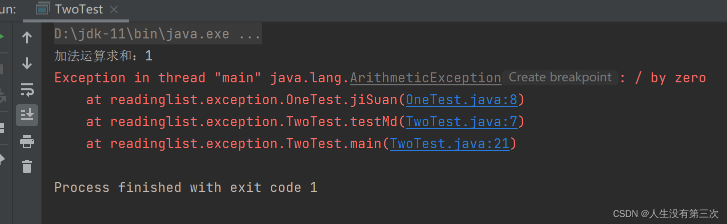 测试结论:OneTest.java类发生异常后未捕获处理,导致OneTest.java类及TwoTest.java类调用点(Onetest.jiSuan(1,0);)之后的所有流程都终止执行了。即,发生异常时,不捕获异常,程序将意外终止。