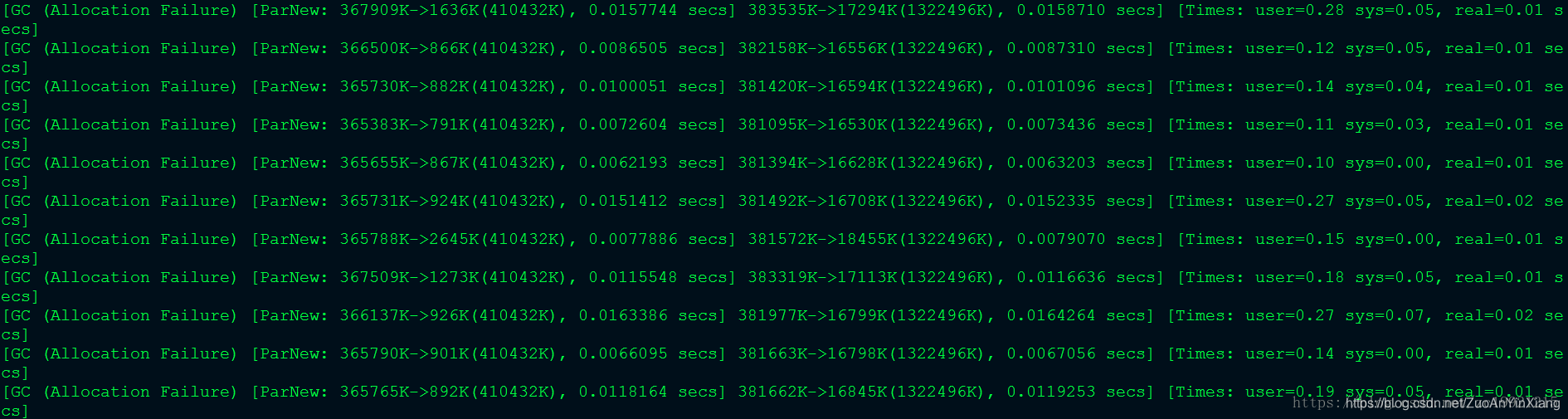 [GC (Allocation Failure) [ParNew: 367523K->1293K(410432K), 0.0023988 secs] 522739K->156516K(1322496K), 0.0025301 secs] [Times: user=0.04 sys=0.00, real=0.01 secs]