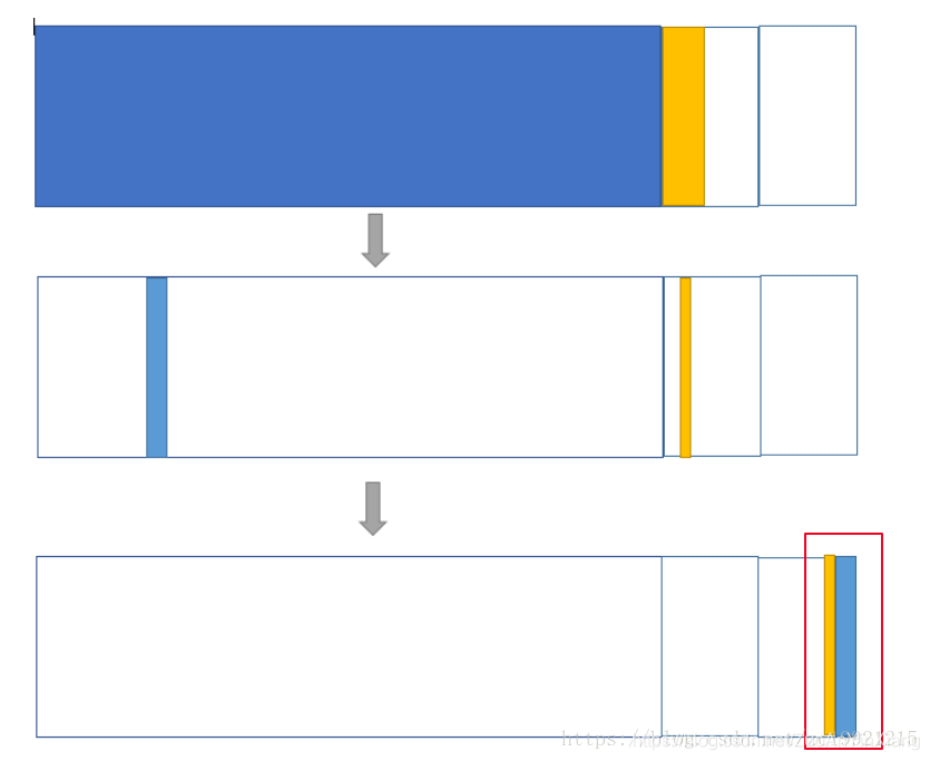 碎片化会导致堆中可能没有足够大的连续空间存放一个大对象,影响程序性能。如果有两块Survivor就能将剩余对象集中到其中一块Survivor上,避免碎片问题。如下图所示: