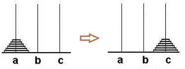 当我们将最大的盘子由a柱移到c柱后,b柱上便是余下的63个盘子,a柱为空。因此现在的目标就变成了将这63个盘子由b柱移到c柱。这个问题和原来的问题完全一样,只是由a柱换为了b柱,规模由64变为了63。因此可以采用相同的方法,先将上面的62个盘子由b柱移到a柱,再将最下面的盘子移到c柱。