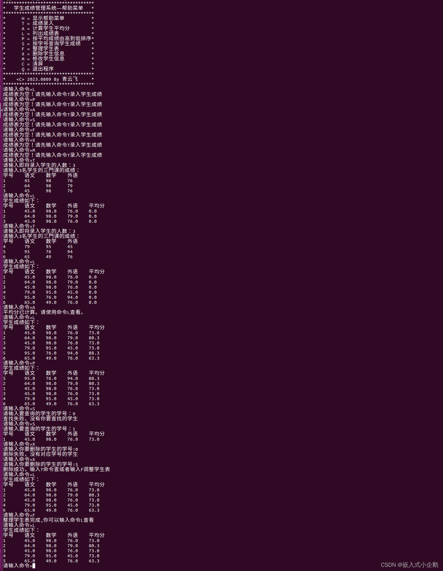 printf("* S = 按学号查询学生成绩 *\n");