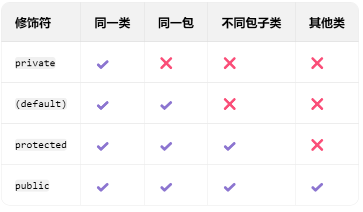 ◌ 默认的(无关键字):包级私有,本类所在的包内所有的文件都可以访问