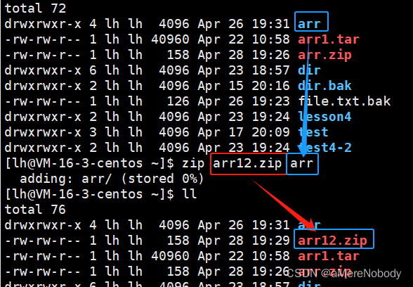 结果:可以看到我压缩我所在目录中的arr目录,为arr12.zip然后我们可以看到一个进度条,然后我再次查看此时我看到了压缩成功的arr12.zip文件。
