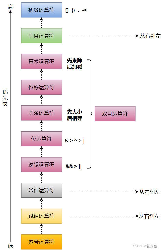 初级运算 > 单目运算 > 双目运算 > 三目运算 > 赋值运算 > 逗号运算