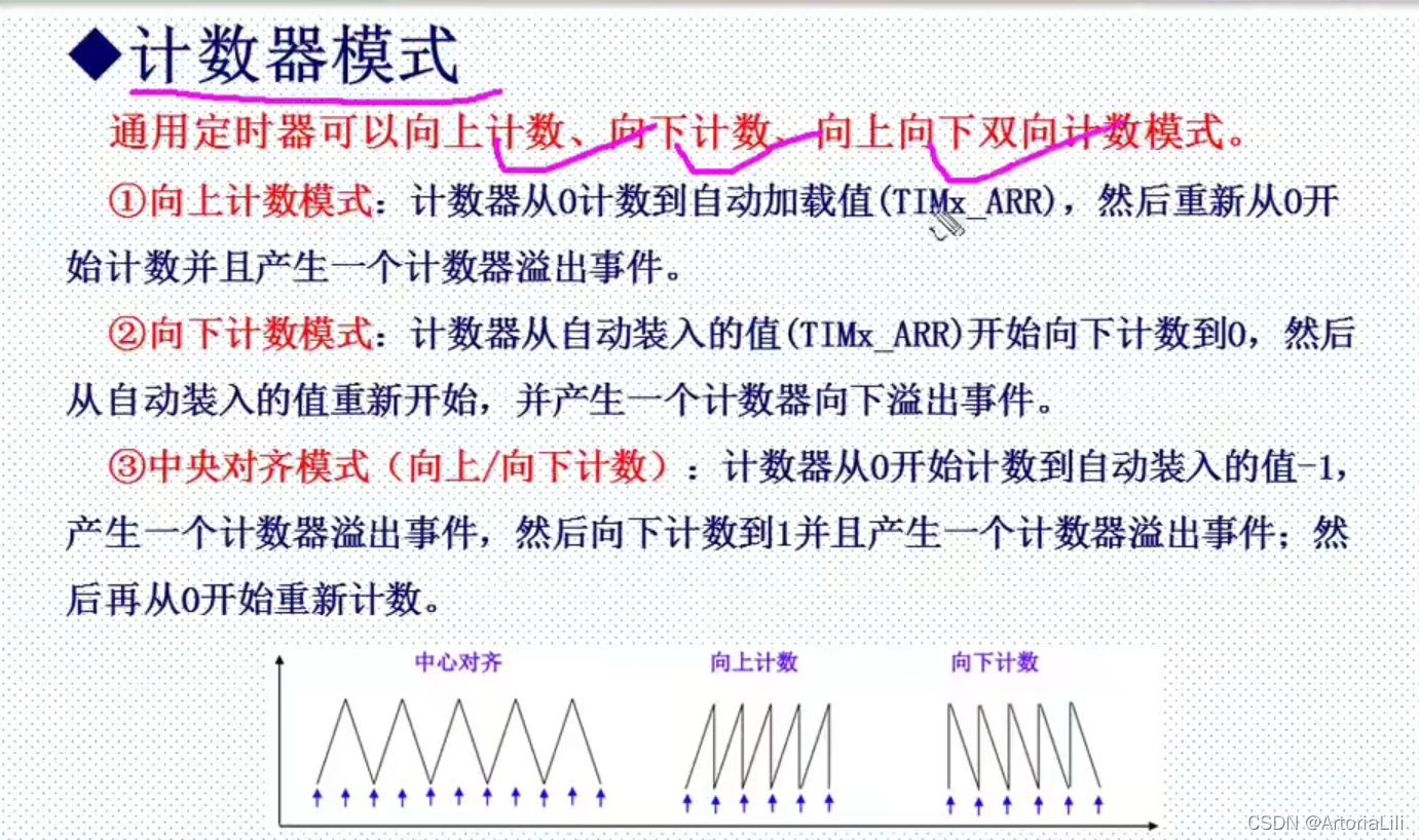 第二个参数 TIM_CounterMode 是用来设置计数方式,比较常用的是向上计数模式 TIM_CounterMode_Up 和向下计数模式 TIM_CounterMode_Down