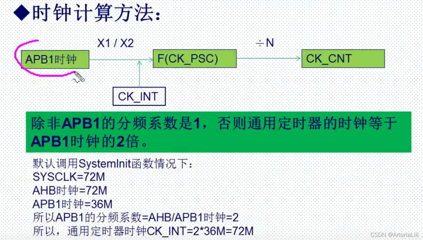 时钟是从 APB1 倍频的来的,STM32 中除非 APB1 的时钟分频数设置为 1,否则通用定时器 TIMx 的时钟是 APB1 时钟的 2 倍,当 APB1 的时钟不分频的时候,通用定时器 TIMx 的时钟就等 于APB1 的时钟。这里还要注意的就是高级定时器的时钟不是来自 APB1,而是来自 APB2 的