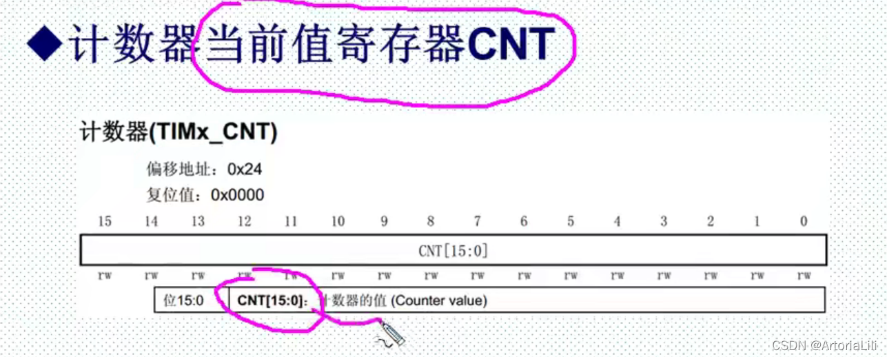 TIMx_CNT 寄存器,该寄存器是定时器的计数器,该寄存器存储了当前 定时器的计数值