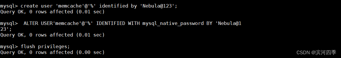mysql_navtive_password,并且设置用户的host范围为%,使所有主机都可以连接create user 'memcache'@'%' identified by 'Nebula@123'; ALTER USER'memcache'@'%' IDENTIFIED WITH mysql_native_password BY 'Nebula@123'; flush privileges;