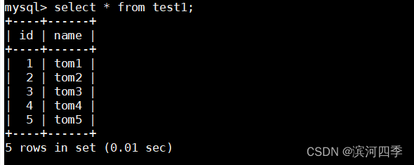 create database testab1; use testab1; create table test1(id int not null auto_increment,name varchar(20) default null,primary key(id)) engine=innodb auto_increment=1 default charset=utf8; insert into test1(name) values ('tom1'),('tom2'),('tom3'),('tom4'),('tom5');