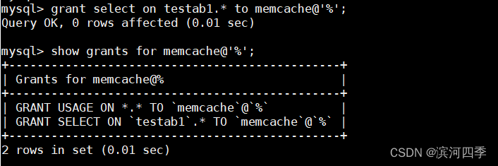 grant select on testab1.* to memcache@'%'; show grants for memcache@'%';