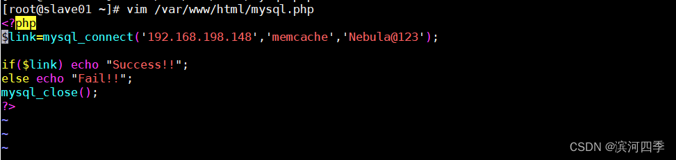 vim /var/www/html/mysql.php<?php $link=mysql_connect('192.168.198.148','memcache','Nebula@123'); if($link) echo "Success!!"; else echo "Fail!!"; mysql_close(); ?>