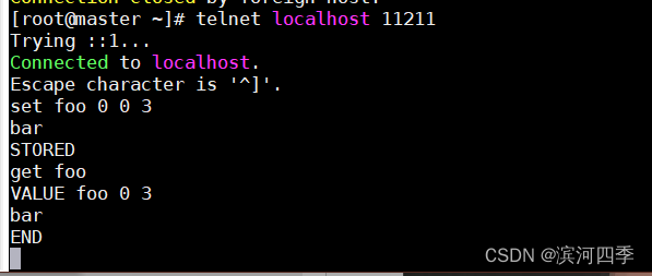 telnet localhost 11211 Connected to localhost.localdomain(127.0.0.1). Escape character is '^]'. set foo 0 0 3 (保存命令) bar (数据) STORED (结果) get foo (取得命令) VALUE foo 0 3 (数据) bar (数据)