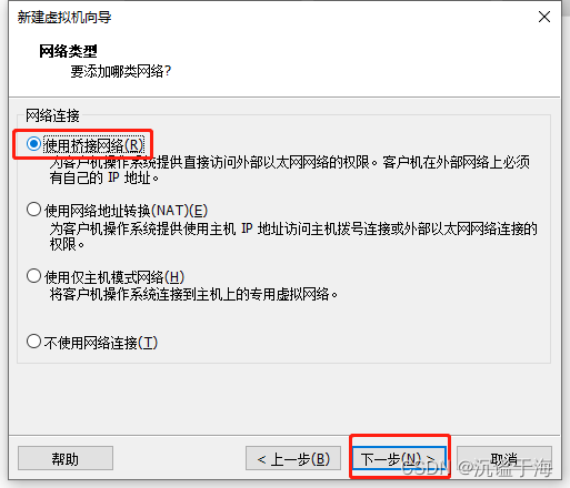 8.设置网络类型,我这里选择的是桥接网络,也可以根据自行需要换成NAT;设置好点击下一步。