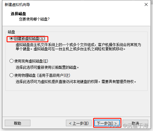 10.选择磁盘:创建新虚拟磁盘;点击下一步。