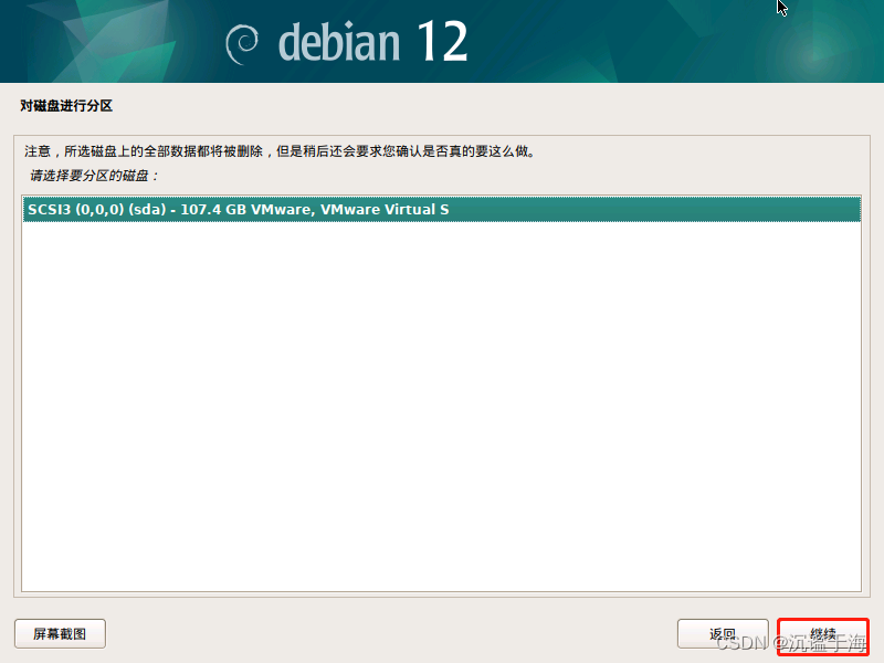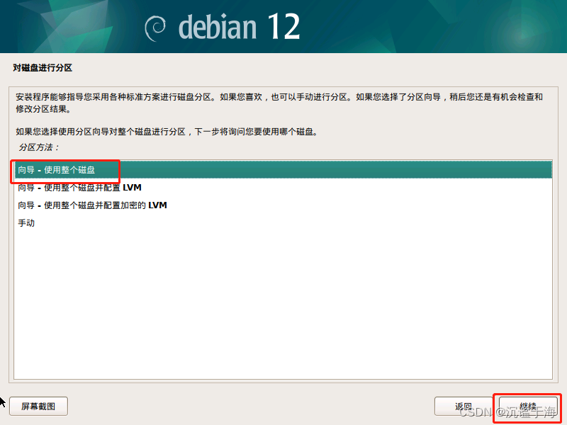 11.对磁盘进行分区,选择“向导 - 使用整个磁盘”,点击继续。