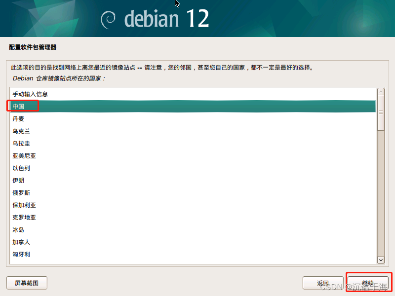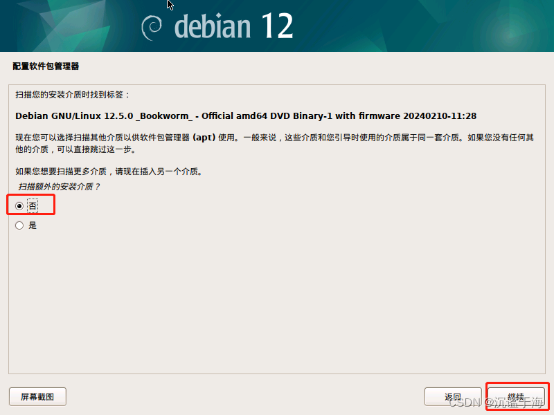 12.配置软件包管理器;是否扫描额外的安装介质,选择“否”,点击继续。
