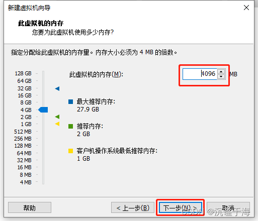 7.设置虚拟机内存,是根据物理机器来配置,建议至少是2G;设置好点击下一步。