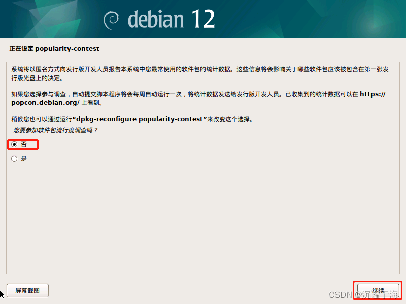14.是否参加软件包流行度调查;选择“否”,点击继续。