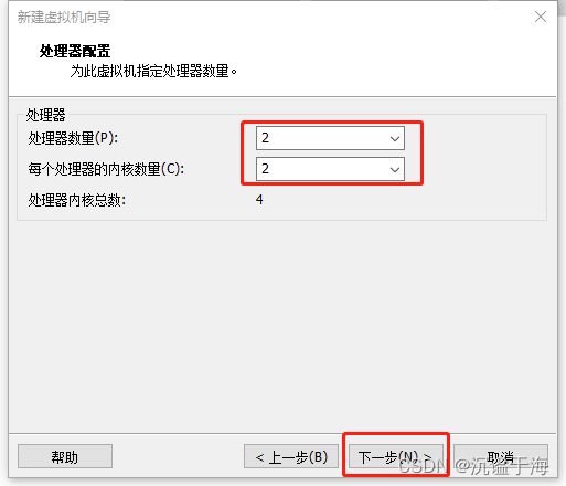 6.设置处理器配置,默认是1*1(处理器一个可能会导致使用过程中卡顿,于是加了一个处理器),建议是2*2,点击下一步。